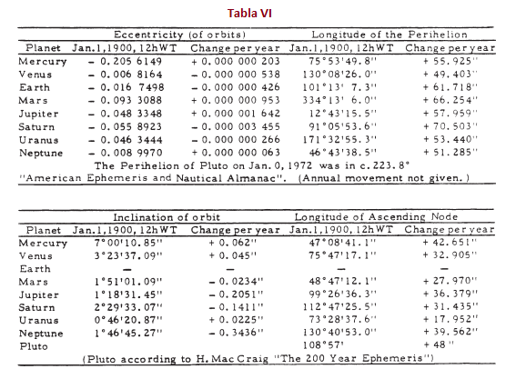 Si, por ejemplo, queremos encontrar la posición del perihelio de Marte el 27 de diciembre de 1571, debemos tomar primero la diferencia de tiempo entre 1571 y 1900. La fecha de 1571 está bastante cerca de enero de 1572, por lo que consideramos que la diferencia es de 328 años (1572-1900). El cambio anual del perihelio es de 66,254s o segundos. Por lo tanto, multiplicamos estos 66,254s por 328 = 21.731s, divididos por 3.600s (1°)= 6° 02′ 11″. Este movimiento de 6° 02′ 11″ en 328 años debemos restarlo de la posición en 1900, porque es, según la Tabla un +, o un avance en el tiempo: la posición del perihelio de Marte en 1900, 334° 13′ 06″, menos 6° 02′ 11″ = 328° 10′ 55″, la posición del perihelio en enero de 1572.