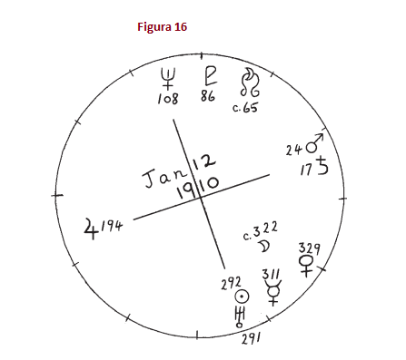 La primera de esas conferencias, el 12 de enero, es especialmente interesante para nosotros por su acompañamiento estelar. Antes de la conferencia, se instó a Rudolf Steiner a que se abstuviera de pronunciarla, porque estaban ocurriendo «acontecimientos espantosos en los cielos». La configuración se muestra en el gráfico de la Fig. 16. Lo que destacaba era una «cuadratura» mayor y total (distancia de 90°) que se producía entre Sol y Urano frente a Neptuno, y Júpiter frente a Saturno. Esto es «muy malo» según la antigua tradición astrológica. Algunos almanaques modernos designan tal acontecimiento con una «B» mayúscula de malo. Rudolf Steiner insistió en proceder y así dio a la humanidad actual esa profunda «anunciación». Al mismo tiempo, se trata de una enseñanza de lo más desafiante para el astrólogo: las conexiones tradicionales relativas al aspecto de cuadratura, y también de todos los demás aspectos planetarios, deben y pueden ser transformadas y elevadas a nuevas realizaciones.