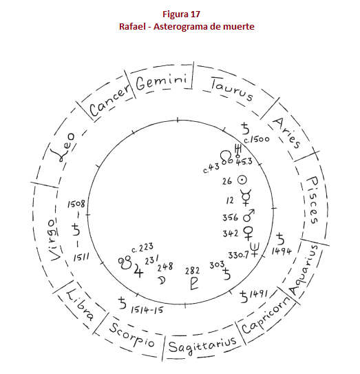 Para demostrarlo más claramente, hemos elegido reimprimir aquí y estudiar el llamado asterograma de la muerte de Rafael Santi (6 de abril de 1520) de la Parte I de mi publicación de hace tiempo[ahora llamada] Isis Sophia III – Nuestra relación con las estrellas. En realidad, encontramos que Saturno crea ese «negativo fotográfico», del que hablamos anteriormente, ya durante el tiempo de vida de un ser humano. Este planeta era llamado, en la antigua Grecia, Padre Tiempo Omnipotente. Así, podemos imaginar que Saturno, como cronólogo universal, anota no sólo los acontecimientos históricos generales, sino también los de la vida del individuo. Esta idea no tiene por qué asombrarnos. Debemos darnos cuenta de que este planeta es mucho más grande que la Tierra y da residencia a muchos seres espirituales que trabajan en esta gran «oficina del cronólogo» cósmico, o registros akásicos.