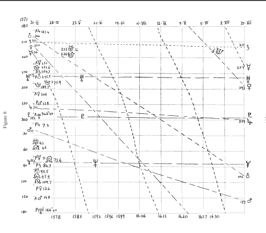 Por ejemplo, encontramos que Venus se movió a través del nodo ascendente de Mercurio al comienzo del 5º ciclo lunar prenatal. Esto se refiere a esos años turbulentos y a la vez decisivos en la vida de Kepler cuando estaba con Tycho Brahe, 1600 y 1601. Luego, al principio del 9º ciclo lunar, Venus estaba en conjunción con Saturno, y ambos planetas estaban cerca del nodo descendente de Mercurio. Estos eventos se asociaron con los últimos años de Kepler, 1629 y 1630. (Aquí vemos las razones por las que combinamos los ciclos lunares geocéntricos con la perspectiva heliocéntrica).