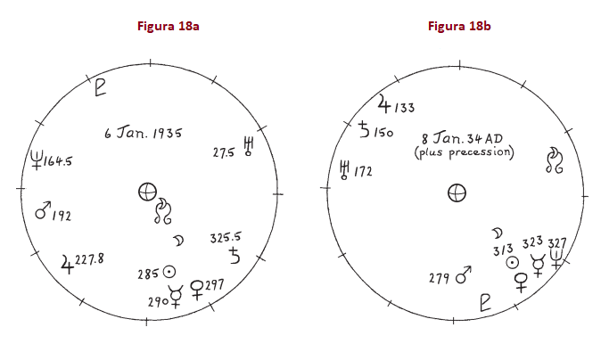 Una comparación de las dos configuraciones muestra, de inmediato, que la posición sideral de Saturno en 1935 era aproximadamente opuesta a la de Saturno en el 34 d.C. También el Sol, Mercurio, Venus y la Luna de 1935 muestran una sorprendente similitud con el 34 d.C. Marte se movió en 1935 a una posición opuesta a la de principios del 31 d.C., que concluimos, fue el momento del Bautismo de Jesús. Júpiter de 1935 está en el lugar opuesto a donde estaba alrededor de la Pascua del 31 d.C. Esto parece estar relacionado con el comienzo del Ministerio de Cristo, es decir, las Bodas de Caná (San Juan II) y la siguiente escena en el templo de Jerusalén.