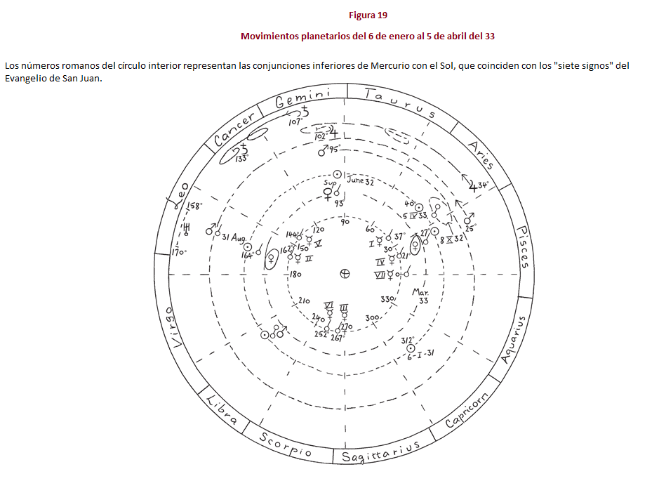 Todo esto también puede ser visto como una nueva revelación del Santo Grial, en un amplio sentido humano. Sin embargo, volveremos sobre estos aspectos en la próxima carta. Para concluir, elaboramos aquí el diagrama de los acontecimientos cósmicos durante el tiempo del Ministerio de Cristo, entre el Bautismo y la Resurrección (ver Fig. 19). Lo hemos ajustado a la tasa de precesión, que actualmente es de 27°, además de las posiciones eclípticas durante el tiempo del 31 al 33 d.C.
