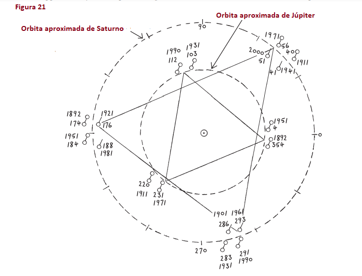 De hecho, este tipo de conciencia de las «conferencias» entre Saturno y Júpiter tiene una larga tradición ocultista en la humanidad. Anteriormente, hemos trabajado en detalle cómo estas conjunciones tienen lugar en un gran triángulo. Este triángulo es como una triple «aguja» en el reloj cósmico, ya que gira lentamente a través de la placa del dial del zodíaco. Las conjunciones en cada uno de los tres ángulos del triángulo vuelven en intervalos de unos 60 años (véase mayo del 69 en Enfoque práctico II). Este ritmo está atravesado por oposiciones que se producen a mitad de camino, es decir, 30 años después o antes de las conjunciones correspondientes. Éstas devuelven a Saturno aproximadamente a la misma esquina, pero Júpiter está entonces opuesto. Así obtenemos un segundo triángulo más pequeño que el primero, porque la órbita de Júpiter, en la que nos basamos, es más pequeña que la de Saturno. El diagrama de la Fig. 21, está elaborado aproximadamente según los tamaños relativos de las órbitas de los dos planetas.