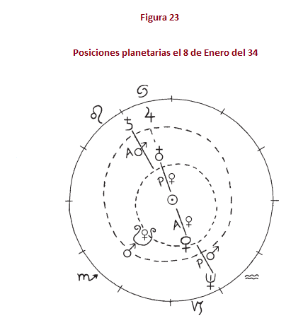 El acontecimiento del 8 de enero del 34 se asoció, además de a otros hechos, a una conjunción superior de Venus con el Sol en la constelación de Capricornio (véase la carta de junio). Se trata de una de las cinco conjunciones superiores que se producen en el transcurso de ocho años en las esquinas de un pentágono, trazado alrededor de la Tierra. Están secundadas por conjunciones inferiores que tienen lugar, aproximadamente en las mismas posiciones de ese pentágono, a intervalos de cuatro años desde las correspondientes conjunciones superiores. Sin embargo, todas estas conjunciones retroceden lentamente, contra el zodíaco, en la secuencia del ritmo de ocho años. Así, todo el pentágono de estos eventos va retrocediendo lentamente y completando una rotación completa a través del zodíaco en unos 1.200 años. En otras palabras, la conjunción superior del 34 d.C. volvió a ocurrir en el 42 d.C., pero entonces ya estaba unos 2º más atrás en el zodíaco, y sólo durante el siglo XIII volvió a la posición del 34 d.C., es decir, a la línea perihelio-afelio de Venus.
