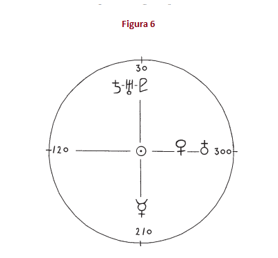 La conjunción de Venus con la Tierra, al comienzo del 4º ciclo lunar prenatal (ver Fig. 5 en la Carta de abril), estuvo acompañada por una conjunción de Mercurio con Marte, seguida de una oposición de Mercurio con Plutón (un poco más tarde también a Urano y Saturno), y al mismo tiempo por una «cuadratura» (90° de distancia) a la Tierra y Venus. En efecto, aparece en ese momento una cruz perfecta en el cielo heliocéntrico, cuyos dos » rayos» estaban así ocupados: Plutón, con Urano y Saturno cerca de él, opuesto Mercurio y la Tierra con Venus en el segundo «travesaño», siendo 90° distante de ambos (ver Fig. 6).