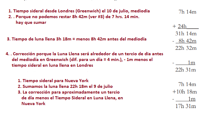 Tomemos un ejemplo para el cálculo del punto de subida de la eclíptica, etc., en un momento dado. La Luna Llena ocurrirá el 10 de julio a las 3:18 a. m., GMT. Lo primero que debemos darnos cuenta es que esta Luna Llena ocurrirá en un momento diferente para cada localidad geográfica alrededor del mundo. Por ejemplo, en Nueva York la luna llena tendrá lugar a las 22:18 (10:18 p. m.) en el del día anterior, porque esta ciudad está casi 75° más al oeste de Greenwich y sigue el horario estándar del este, que es 5 horas antes que Greenwich. (Cada 15° representa una diferencia de una hora.) Cuando es temprano en la mañana en Inglaterra, todavía es tarde en la noche del día anterior en Nueva York. Ahora consultamos una efeméride astronómica referente al Tiempo Sideral. Por ejemplo, las Efemérides astronómicas de Rafael de 1968 (publicadas por W. Foulsham & Co. LTD., Inglaterra) dan 7 horas. 14 min., como tiempo sideral al mediodía del 10 de julio, p. 14, primera columna después de «Días del mes» y “Días de la semana”. Esto significa simplemente que el punto vernal culminó en ese día, 7 hrs. 14 minutos antes del mediodía, según el Sol. Ahora calculamos: