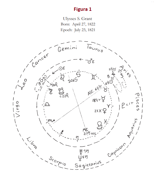 Como representante hemos escogido la carta natal y prenatal de Ulysses Simpson Grant, el gran y exitoso general de los ejércitos de la Unión contra los confederados del sur durante la Guerra Civil Americana y más tarde el 18º presidente de los EE.UU. El siguiente diagrama (Fig. 1) muestra las posiciones de los planetas, etc., en el momento del nacimiento en el círculo interior, de acuerdo con la práctica astrológica habitual. En el círculo exterior añadimos los movimientos de los planetas durante la gestación, a partir de la época astrológica, según la Regla Hermética.
