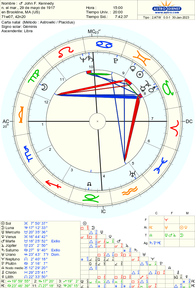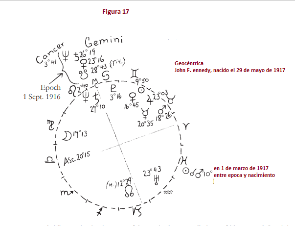 Así podemos mirar a Saturno en una carta como el que da el motivo fundamental de la perspectiva de la «sinfonía de la vida» con la que está conectado, y los otros planetas evolucionan este motivo según su propia dinámica. Hemos demostrado esto en nuestra descripción anterior de las cartas de Soloviev y Van Gogh (ver la edición de agosto de 1967), en lo que se refiere a Saturno en Aries. Los impactos motivadores de Saturno en las constelaciones de Tauro y Géminis los describimos en asociación con la carta de Copérnico (ver enero ’67 y f.). Ahora iremos más allá y resolveremos las implicaciones presentadas en un gráfico donde Saturno está en la constelación de Cáncer. Para ello hemos escogido el asterograma de la encarnación del presidente de los Estados Unidos John F. Kennedy, nacido el 29 de mayo de 1917 en Brookline, Mass. (Ver también información en el Boletín AFA de enero de 1964).