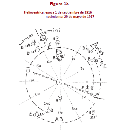 Los rasgos más interesantes de este cuadro se revelan en relación con el reflejo prenatal del momento del asesinato. En la edición de febrero del 67, señalamos que los ciclos lunares prenatales (sideral) están conectados con los períodos de siete años en la vida posterior. Así, el tiempo de 46 años y medio en la carrera de John F. Kennedy se asoció con las posiciones de los planetas el 1 de marzo de 1917. Fue asesinado el 22 de noviembre de 1963. La carta heliocéntrica muestra que Mercurio en ese momento estaba (como alguna vez estuvo durante la gestación) en el afelio de Saturno. Venus estaba casi opuesto a todo el complejo de Saturno y Neptuno en Cáncer. La característica más interesante, sin embargo, fue una oposición exacta entre la Tierra y Marte, que entonces se encontraba en su propio perihelio. El énfasis de este Marte en ese momento estaba en la proximidad a los asuntos del mundo solar, lo opuesto a un movimiento sideral espiritualmente elegante que puede mostrar en el afelio. Además, Marte estaba en el lugar donde estaba la Tierra en la época (ver gráfico) y, por así decirlo, atacó a esta última.