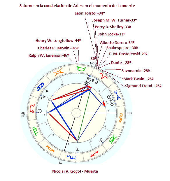 Nicolai V. Gogol, el novelista y dramaturgo ruso, murió el 21 de febrero de 1852 (Saturno en 36°). La Encyclopedia Britannica dice de él: «… Fue un gran artista y aunque tanto la comedia como la novela fueron ‘acontecimientos’ en la historia de Rusia, son lo que son debido al genio imaginativo del autor. Gogol el hombre se encontró a sí mismo como el héroe de aquellos que regenerarían Rusia… «