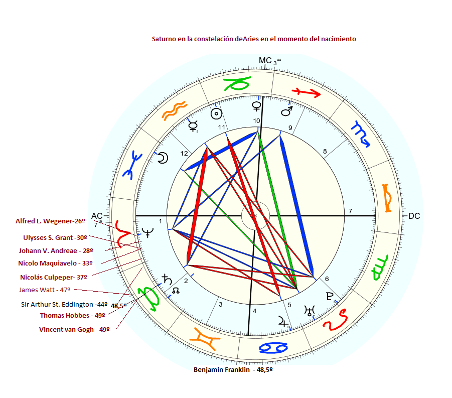 Benjamin Franklin fue una persona que desplegó las características de la iniciativa espiritual cósmica en su vida, ya que aparece conectado con Aries. Durante su desarrollo prenatal (nacido el 6 de enero de 1706 o.s.), Saturno transitó por la constelación de Aries (al nacer 48,5° de la eclíptica). A. E. Abott escribe en su Enciclopedia de las Ciencias Ocultas (Emerson Press) de él: “Era un iniciado de la voluntad, una característica del pueblo americano. Su Almanaque del pobre Richard fue una expresión del espíritu verdaderamente estadounidense. Estaba profundamente versado en la Cábala. Algunos creían que fue instruido por el conde de St. Germain (el famoso ocultista europeo del siglo XVIII) durante su estancia en Francia. Franklin unió dos corrientes, la corriente cuáquera (de William Penn) y la corriente masónica libre que encontró en Londres. Sus logros científicos comenzaron a los 42 años. Fundó la Academia de Filadelfia, la piedra fundamental de todas las academias académicas en Estados Unidos. Sus experimentos eléctricos causaron revuelo en los círculos científicos europeos y pusieron en marcha la era eléctrica. Inventó el pararrayos. Franklin afirmó su creencia en la reencarnación”.