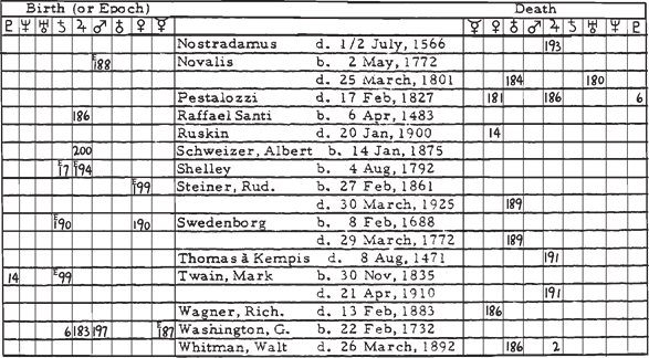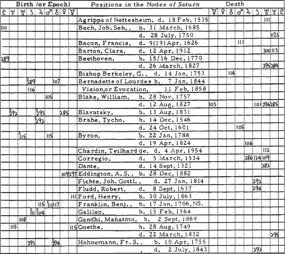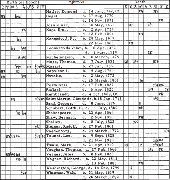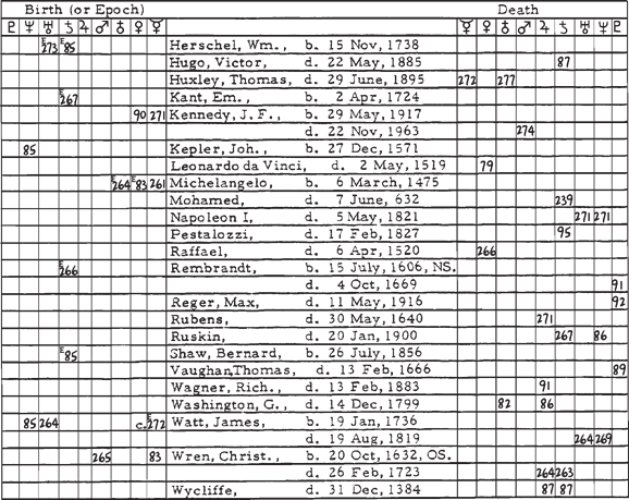 Además, unos pocos «cuadros de la memoria» contenidos en las configuraciones de la muerte de personalidades históricas cuentan historias similares de la vida de los seres humanos. (Hemos señalado anteriormente que se puede descubrir, sobre la base de los tránsitos precedentes de Saturno sobre las posiciones de los planetas en el momento de la muerte, que estas configuraciones llevan la totalidad de la historia de la vida de un ser humano).