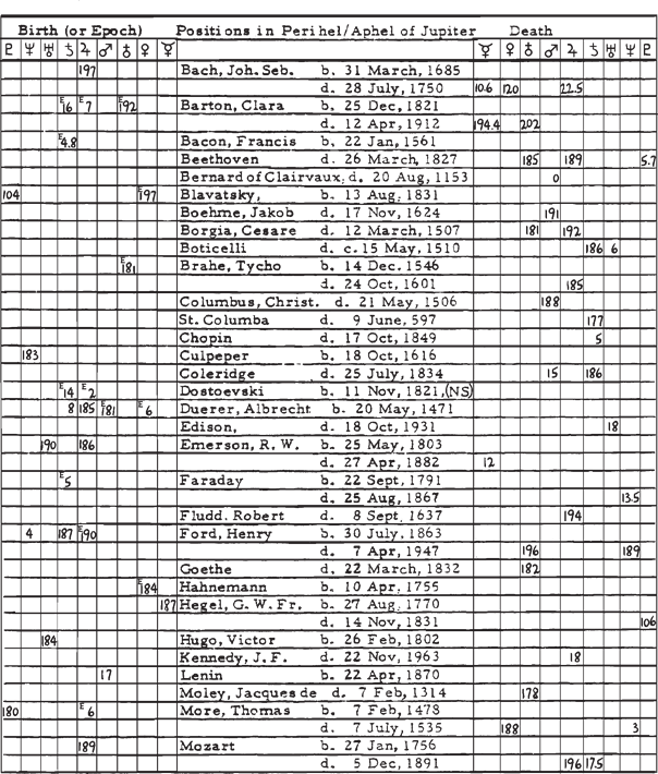 El perihelio de Plutón se dio en 223,18° en enero de 1958. El American Ephemeris and Nautical Almanac cita la posición de este elemento para febrero de 1974 en 224,3121°. Aún no hemos podido descubrir el movimiento medio anual. Sin embargo, parece coincidir con las líneas nodales de Mercurio y Marte, por lo que tenemos la impresión de que una lista de personalidades con fechas y posiciones históricas no ofrecería mucha más ayuda práctica. Las líneas nodales de estos planetas interiores parecen ser más estables. Sin embargo, coinciden con los elementos de los planetas clásicos; por ejemplo, los nodos de Urano están cerca de los nodos de Venus. De hecho, coincidieron en torno a 1347 d.C., y en la actualidad no distan mucho más de 2°. Por lo tanto, no creemos que sea necesario, también en este caso, volver a enumerar las personalidades históricas.