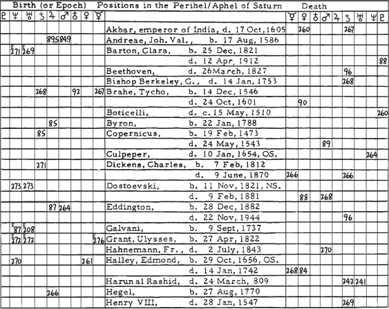 Las asociaciones de planetas con la línea perihelio-afelio de Saturno suelen funcionar como momentos de decisión, a veces decisiones que van mucho más allá de las preocupaciones del individuo. Por ejemplo, Copérnico encarnó (1473) cuando Saturno (85°) estaba en su perihelio. Unos 29-30 años más tarde, Saturno se encontraba de nuevo en la misma posición. Tales retornos de los planetas a los lugares donde se encontraban al nacer son como recuerdos, que reflejan las intenciones que condujeron a la encarnación. Copérnico estaba entonces, en 1502-3, todavía en Bolonia, estudiando derecho canónico. Además, asistía a las conferencias del astrónomo Novara y se familiarizó con la astronomía heliocéntrica pitagórica. Obviamente, adoptó la teoría heliocéntrica, que elaboró en los años siguientes. Ahora sabemos que esta decisión no fue sólo un asunto personal suyo, sino que llegó a afectar a toda la humanidad moderna.