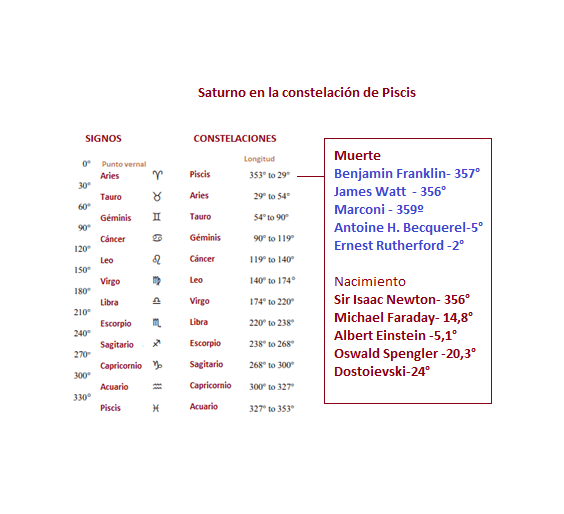 Benjamin Franklin, un personaje universal, estadista, diplomático, autor, científico e inventor, murió cuando Saturno estaba en Piscis (357°, 17 de abril de 1790). Son conocidos sus experimentos en el campo de la electricidad y la invención del pararrayos.