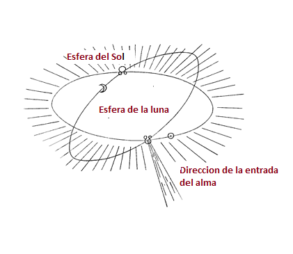 Existe también otro aspecto: en cierto momento, las esferas del Sol y la Luna se encuentran íntimamente relacionadas a través de los nodos lunares precisamente en la dirección de la entrada cósmica del alma. De este modo, la imagen del descenso del alma humana desde las esferas superiores a la Tierra se vuelve más vívida. En la esfera solar, la vida anímica aún experimenta, mediante poderosas revelaciones, la realidad espiritual de los dioses.