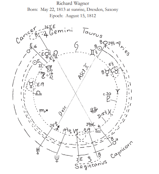 Sin embargo, si el Sol está saliendo al nacer, es decir, si está en conjunción con el ascendente, como es el caso del asterograma de Richard Wagner, esta situación plantea la cuestión de si la «imagen del yo», el Sol, no está interfiriendo con la «imagen del cuerpo etérico». A esto se suma el hecho de que el Sol al nacer ya había entrado en la constelación de Tauro, que es la región cósmica más allá de la cual buscamos el arquetipo de la región corporal de la laringe, los oídos, todo aquello que el poeta, el músico y el compositor necesita especialmente. En el caso de Wagner, esta afinidad parece haber sido más poderosa, pero impuso, en cierto sentido, una tremenda tensión sobre la placidez y la calma necesarias que necesita el cuerpo etérico. Este hecho se expresó en su temperamento volátil, en la inundación ocasional de su ser con una sobreabundancia de astralidad, que también fue una ventaja, hasta cierto punto, en la batalla de su vida. Ya a la edad de unos catorce años, escribió un drama donde mueren cuarenta y dos personas.
