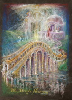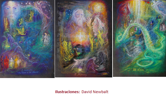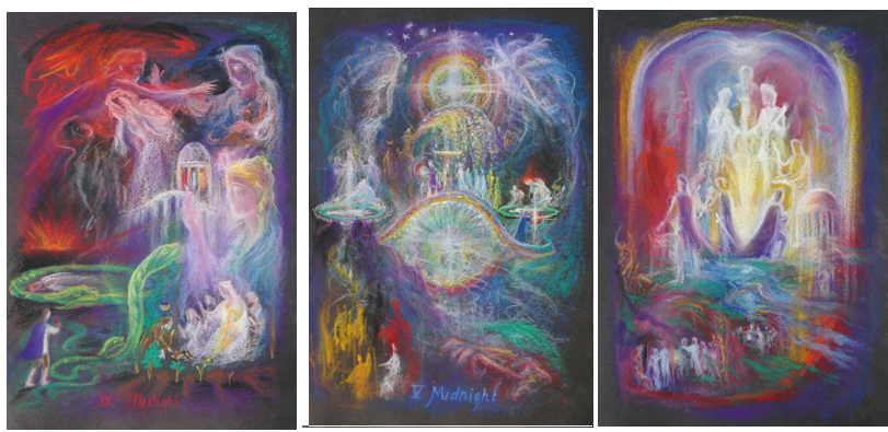 Esto es por lo que se han esforzado los místicos de todas las épocas: dejar que la naturaleza inferior se extinga y permitir que brote lo que mora en el Espíritu; la extinción de la realidad de los sentidos, para que el hombre ascienda al Reino de los «Propósitos Divinos». «Morir para devenir». Si no poseemos este poder, no conocemos las fuerzas que vibran en nuestro mundo, y no somos más que un «trüber Gast» (invitado sombrío) en nuestra Tierra. Goethe dio expresión a esto en su «West-Ostlichen Divan», y esto trata de representarlo en todas las diferentes partes del «Cuento de hadas» de la «Serpiente verde y el hermoso lirio». La transición del hombre de una etapa de existencia a otra superior. Ese era el enigma que quería resolver, el enigma de cómo un hombre que vive en el mundo cotidiano, y que solo puede ver con los ojos y oír con los oídos, muere y se transforma.