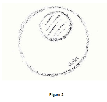 Cuando uno pronuncia la O, trata de llevar lo que encuentra su expresión en la forma esférica de la cabeza a expresión en toda la cabeza etérica. Uno hace el esfuerzo de formar una segunda cabeza para sí mismo (ver el violeta en el dibujo) y realmente se puede decir que al pronunciar la O el hombre se hincha como su cabeza, se hincha, se hincha y despierta así las fuerzas que le dan en el otro polo la tendencia a engordar. Estas cosas también se pueden tomar pictóricamente. La inflación de su propia cabeza le da la tendencia a engordar. Cuando uno quiere contrarrestar esta tendencia a convertirse, etéricamente hablando, en una cabeza gorda —no realmente una cabeza gorda, pero etéricamente una cabeza gorda— para volverse una cabeza grande, entonces uno debe intentar redondearlo desde el otro lado, para volver a tomarlo dentro de uno mismo. Y esa es la protesta del cabezota. Por lo tanto, una O está abanicada en el polo opuesto. Todos los sonidos individuales tienen un matiz de sentimiento, a saber, que está profundamente establecido en el organismo, porque reside en el inconsciente; de ahí la importancia del ser interior del sonido. Para la persona que mira el asunto de una manera suprasensible, la rana que quisiera volar en un buey, ya ven, es aquella de la que un tono O como un cañón procedería continuamente si fuera capaz de cumplir su intención Esa es la peculiaridad de esto —uno debe explicar por medio de tales cosas si uno desea comprender estos asuntos interiormente.