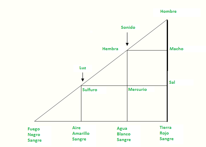 Si un esotérico medita en estas líneas y en el diagrama le dará mucha fuerza. Durante el período de Antiguo Saturno había solamente una esfera del calor en el cual los espíritus de la oscuridad (Arcai –nt)) alcanzaron su etapa humana. La sangre que teníamos entonces era oscura. Había un fuego o calor escondido en el planeta, pero no había luz. Cuando Saturno desapareció, el Sol se levantó de la oscuridad, el segundo, el elemento aéreo con su oxígeno hizo que el brillo de Saturno estallara en llamas, y entonces hubo luz, como simboliza el azufre del alquimista. La sangre pasó de negro a amarillo.