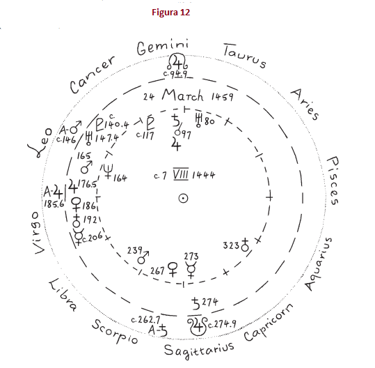 Entonces, el 24 de marzo de 1459, que era la «víspera antes del Domingo de Pascua» (el primer día de las Bodas Alquímicas), Saturno estaba en el nodo descendente de Júpiter (véase el segundo círculo en el diagrama). También Urano y Venus estaban en lugares significativos. Urano estaba en la línea extendida del afelio de Marte, donde Marte había estado en Pentecostés del 33 d.C., y Venus estaba en el afelio de Júpiter. Eso era aproximadamente opuesto al lugar donde había tenido lugar la gran conjunción del 6 a.C., la conjunción de la Anunciación, en un sentido amplio.