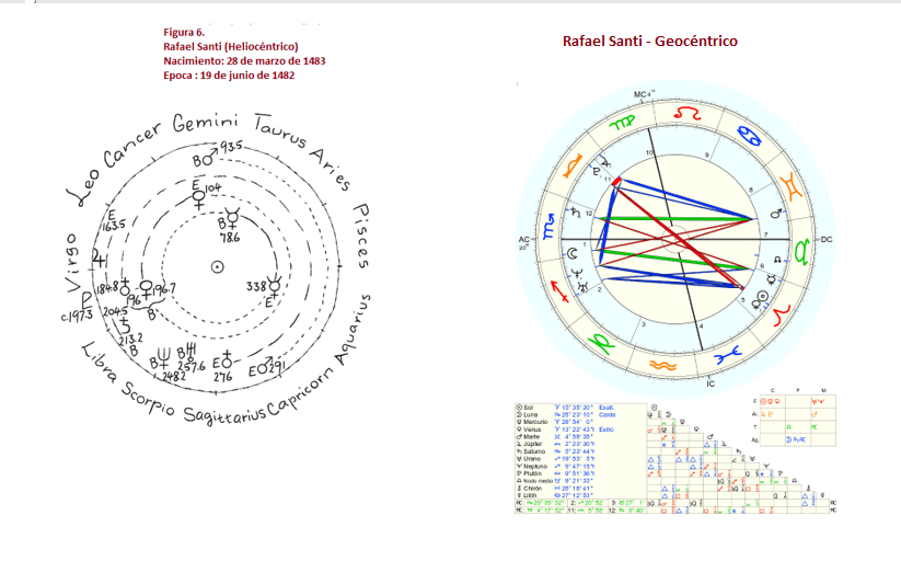 Júpiter en la constelación de Virgo: es la siguiente posición que queremos investigar. Uno de los mejores ejemplos históricos es la natividad de Raffaello Santi o simplemente Rafael, el gran pintor del Renacimiento, nacido el Viernes Santo de 1483 (28 de marzo en el calendario juliano y 6 de abril en el calendario gregoriano). Producimos aquí el diagrama heliocéntrico de su nacimiento. Ya ha sido mencionado en la edición de octubre del 68.