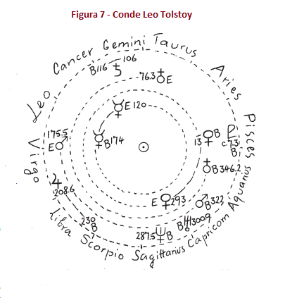 Para ejemplificar el potencial de un Júpiter en Libra en términos prácticos, hemos elegido el asterograma de la encarnación del Conde León Tolstoi (época del 9 de diciembre de 1827 y nacimiento del 9 de septiembre de 1828, n.s.). Vemos que Júpiter está en la constelación de Libra la mayor parte del tiempo prenatal.