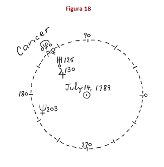 A continuación, se ilustran cuatro gráficos abreviados, tres de los cuales presentan las configuraciones heliocéntricas de los cielos en la época de las grandes revoluciones sociales: La primera muestra la situación en vísperas de la Revolución Francesa (Fig. 18). Júpiter acababa de pasar a Urano en conjunción y estaba cerca del nodo ascendente de Neptuno y del perihelio de Venus. Al mismo tiempo se encontraba en un aspecto llamado quintil, o a 72° de distancia, de Neptuno. La cercanía de Urano y Júpiter a los elementos de las esferas de Neptuno y Venus concuerda con lo que dijimos anteriormente (enero del 66) sobre las implicaciones contenidas en la cercana coincidencia de estas líneas que identifican las esferas planetarias.
