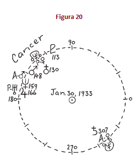 En 1933, en Alemania, los nacionalsocialistas tomaron el poder bajo el liderazgo de Hitler y sus socios. La carta de aquel día es de lo más dramática. La Tierra en ese momento estaba en la línea nodal ascendente de Neptuno y perihelio de Venus, mientras que Saturno estaba en la porción opuesta del Zodíaco. Volvemos a ver aquí el signo principal de la gran crisis social de nuestra era moderna. Sin embargo, había también otras implicaciones de naturaleza seria que daban indicaciones significativas de por qué este acontecimiento histórico en la esfera de la evolución social fracasó tan terriblemente. Marte casi había entrado en su propio afelio, Neptuno aún estaba cerca de él, y por el otro lado Plutón se acercaba a esa «línea de la vida» de los impulsos sociales modernos, los elementos de las esferas de Venus y Neptuno.