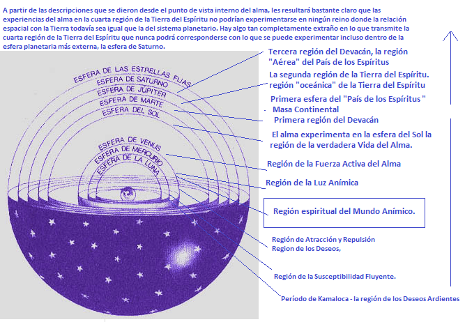 Por tanto, el alma pasa al firmamento estelar, es decir a distancias cada vez más alejadas tanto de la Tierra como del Sol. Estos reinos distantes se describen en el relato de las tres regiones más elevadas del País de los Espíritus atravesadas por el alma antes de comenzar a reunirse nuevamente y pasar, en orden inverso, por todas las condiciones anteriores. En este viaje el alma adquiere las fuerzas mediante las cuales puede construir una nueva vida en la Tierra.