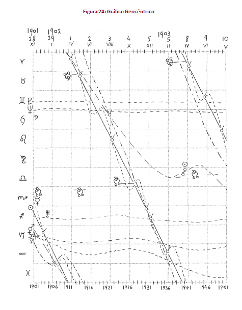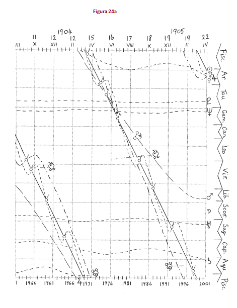 Hemos dispuesto el gráfico de la Fig. 24 según este principio temporal. La correlación 1 año solar equivale a 1 año de Saturno de 29,4578 años solares da como resultado que 12,4 días equivalen a 1 año solar. Esta relación la hemos insertado a lo largo del borde superior. Una partición, de izquierda a derecha, representa un intervalo de tiempo de 5 x 12,4 días es 62 días, lo que equivale a 5 años en correlación solar. A lo largo del borde inferior hemos indicado la relación con el progreso del siglo XX en años Sol, a partir de 1901.