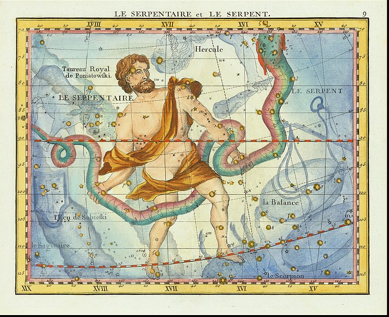 Las conjunciones de Venus, Mercurio y el Sol con Urano alrededor del 11 al 14 de diciembre de 1902, que hemos mencionado anteriormente, pueden tratarse de forma similar. Tuvieron lugar cerca de la estrella fija Lesath, el aguijón de Escorpio. Aquí tendríamos plena oportunidad de caer en la melancolía. Sin embargo, observamos la vecindad de Escorpio y, en efecto, encontramos sobre ella la estrella fija RasAlague, la cabeza de Ofiuco, y también su estrella Eta, o rodilla izquierda. Esto nos lleva a la conclusión de que este Escorpio puede y debe ser redimido y elevado. Ofiuco, «el hombre que sostiene la serpiente» (véase Peter Lum, Las estrellas en nuestro cielo), es Asclepio, el gran médico de la mitología griega. A través de la serpiente que lleva en sus manos, entró en posesión de la hierba curativa que no sólo sanaba a los enfermos, sino que incluso podía resucitar a los muertos. Sin embargo, los dioses decretaron que en la Tierra debía prevalecer la ley de la muerte, al menos durante un tiempo. Por ello, Asclepio Ofiuco fue retirado de la Tierra y colocado entre las estrellas.