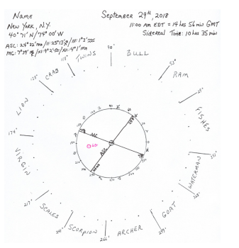 Ahora que tenemos el Sol colocado, simplemente vaya a las efemérides, siga la línea para el 29 de septiembre y coloque sus planetas. Recomendaría comenzar con el planeta más externo y avanzar hacia adentro, colocando a Plutón, Neptuno y Urano hacia la periferia de este círculo interno en el diagrama; luego Saturno un poco más adentro, Júpiter un poco más, Marte un poco más y luego tienes el Sol. Dependiendo de si Venus o Mercurio están retrógrados al momento del nacimiento, tendrás a Venus y Mercurio fuera del Sol hacia la periferia, o puede que los tengas muy cerca del Sol, o entre el Sol y la Tierra que está en el centro del diagrama. Mientras dibujas, ten en cuenta que tienes espacio para los planetas. Es posible que tengas un grupo de planetas y necesites espacio allí para dibujarlos. Por lo tanto, sugeriría hacerlo primero con lápiz en caso de que necesites borrarlo y moverlos un poco para dejar espacio. Al lado de cada planeta, coloque los grados que se enumeran en las efemérides, que son los grados del zodíaco tropical, que es el círculo con los símbolos de signos más pequeños, comenzando con Aries en 0 grados hasta 30 grados.