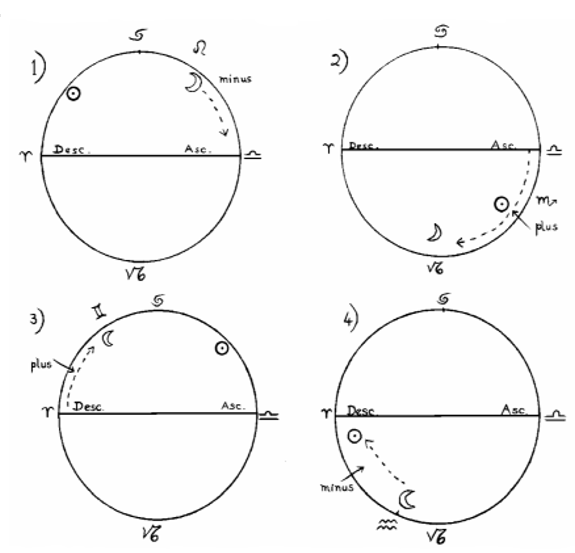 | Regla Hermética: 1. La Luna está creciente y por encima del horizonte (designado por la línea horizontal de ascendente a descendente). Entonces, en la llamada época de la concepción, la Luna habría estado en el zodíaco que aparece como el lugar del ascendente, es decir, en este caso en el signo de Libra. La época sería menor que 273 días porque regresar a donde está la Luna al nacer da menos tiempo que regresar completamente al ASC (Libra). 2. La Luna está creciente, pero por debajo del horizonte. En esa época, la Luna también habría estado en el ascendente al nacer (Libra). La época sería más larga que 273 porque tomaría más de 273 días pasar el ASC en Libra y llegar a Capricornio. 3. La Luna está menguante y sobre el horizonte. Luego, en la llamada época de la concepción, la Luna habría estado en el lugar del zodíaco que aparece como el descendiente del nacimiento (Aries en el diagrama anterior). La Época sería un poco más larga que los 273 días, el tiempo que llevó pasar el Descendente a Géminis. 4. La Luna también está menguante, pero por debajo del horizonte. La época también habría sido la del descendente del nacimiento. La época tardaría menos de 273 días en regresar al descendente (de Acuario a Aries). |