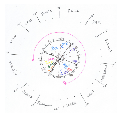 Terminamos la última sesión con la carta natal completa. El círculo interior de la plantilla ahora está poblado con las posiciones de los planetas en el momento del nacimiento, con la línea Ascendente/Descendente y la posición calculada de la Luna. Hablamos de la importancia del ascendente y de la Luna en la carta, lo que nos llevaría a otro misterio sobre la encarnación del individuo. A continuación, se muestra una cita de Rudolf Steiner para ayudarnos a comenzar: