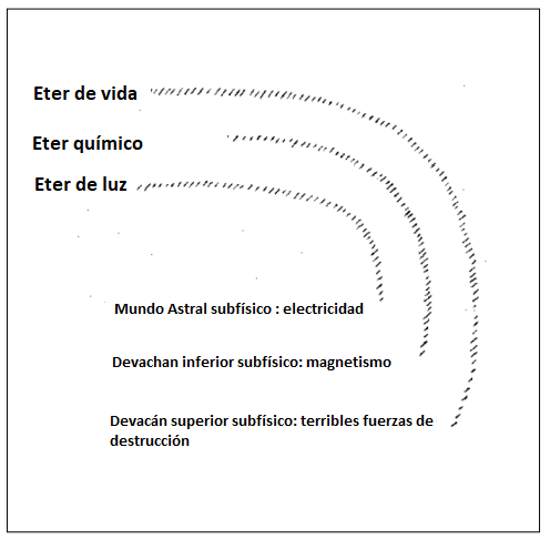 Cuando la acción química es impulsada hacia abajo del plano físico, hacia el mundo devacánico rezagado, surge el magnetismo. Cuando la luz es lanzada hacia lo submaterial, es decir, a un nivel más profundo que el mundo material, surge la electricidad. Si eso que vive en la Armonía de las Esferas es empujado aún más hacia abajo, entra en la esfera de los Asuras, se genera una fuerza aún más terrible -que no será posible mantener oculta mucho más tiempo-. Sólo cabe esperar que cuando esta fuerza llegue a ser conocida -una fuerza que debemos concebir como mucho, mucho más fuerte que la descarga eléctrica más violenta- sólo cabe esperar que antes de que algún descubridor entregue esta fuerza en manos de humanidad, a los hombres ya no les quedará nada inmoral.