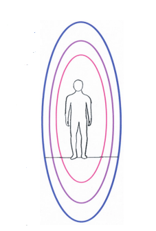 Exploremos ahora el significado más profundo de estas esferas planetarias. Aquí se muestra la imagen de la forma humana situada en el plano de la Tierra; la Tierra abajo, los cielos arriba. Podemos imaginar cómo dentro de esta forma humana están contenidos los planetas clásicos. Están integrados en nuestro cuerpo físico. Entonces, ¿dónde están estos tres planetas transpersonales? ¿Cómo se relacionan con el ser humano? Ahora podemos agregar algo a esta imagen. Podemos imaginar tres esferas alrededor del ser humano. Una esfera elíptica que va por encima y por debajo de los pies hacia los niveles subterráneos interiores de la Tierra. Una segunda esfera más arriba y más abajo y una tercera esfera aún más arriba y más abajo en el elemento subterráneo de la Tierra.