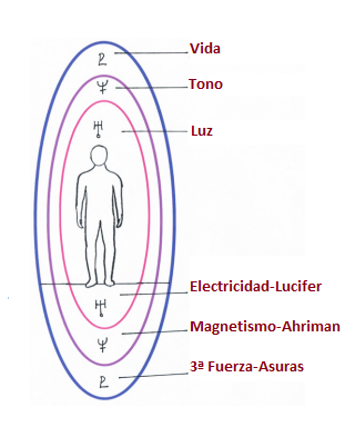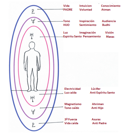 Agreguemos esto a nuestra imagen de la forma humana situada en la Tierra con estas tres esferas a su alrededor. Como se puede ver en la imagen: el primer reino inferior de electricidad o Luciférico como luz caída; magnetismo, Ahriman, tono o químico caído; y la tercera fuerza, los Asuras, la vida caída. Por encima del ser humano se encuentran los elementos superiores de luz, tono y vida.
