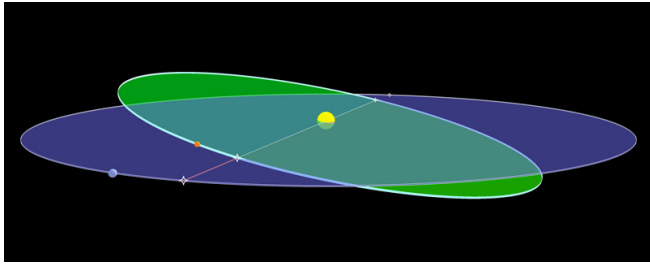 La segunda imagen es una imagen un poco más enfocada de estos dos planos que se cruzan y se puede ver a cada lado del círculo que están estos dos puntos, donde en un punto el planeta gira y desciende por debajo del plano de la órbita de la Tierra ascendiendo después por encima del plano. Estos dos puntos de intersección se denominan nodos ascendentes y descendentes. Este es un fenómeno astronómico. Espiritualmente hablando, hablamos de los nodos lunares en el modelo geocéntrico, por lo que, en el heliocéntrico, estos nodos, son portales o puntos de conexión entre las esferas planetarias y la esfera terrestre.