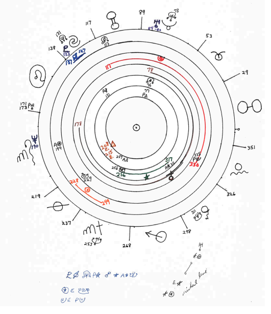 Al nacer se puede ver… ahora aquí, por supuesto, la línea verde es muy corta, pero se puede pensar que Venus ha dado una vuelta completa una vez y esta es la continuación, porque Venus tarda menos de un año en dar una vuelta completa al Sol. – Venus en el nacimiento entra en el afelio de Venus. Tenemos aquí esta imagen muy especial de Venus en la época en sus propios elementos en la línea de Miguel y en el nacimiento nuevamente en su propio elemento, la línea de afelio. También es significativo que, al nacer, se encuentre frente a Saturno, o el camino de Saturno durante el período prenatal, y frente a Plutón. Esta configuración en el nacimiento de Venus frente a Saturno y Plutón nos llevaría demasiado profundamente en esta carta por ahora, pero es una configuración muy poderosa que podemos seguir plenamente al sentarnos con una carta natal. De hecho, vería esto como un tema central en el que este individuo debe centrarse en este gráfico.
