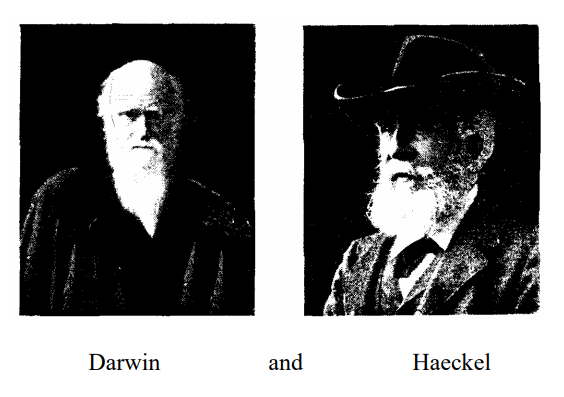«Debo ahora introducir algo que parece bastante paradójico y que puede creerse o no según lo sienta el lector inclinado, pero que tal vez podría permitirse en una revista que combina «Misticismo moderno» y «Ciencia del Naturalismo moderno»… Mientras Darwin recopila su material (durante su gira mundial) para El origen de las especies, Haeckel está en su propio desarrollo embrionario realizando sus experiencias prenatales sobre el origen de su ser…»