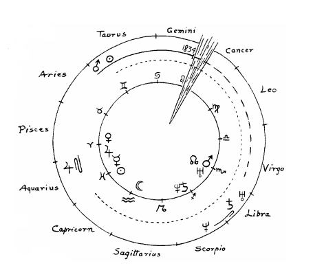 Es cierto que la hora del nacimiento es desconocida para ninguno de los dos, pero a pesar de esto encontramos resultados más fructíferos cuando invocamos en nuestra ayuda los hechos de las constelaciones prenatales. Si desde este punto de vista partimos de los movimientos de Júpiter en los dos horóscopos, observamos cosas notables. En el caso de Darwin, Júpiter proviene de la constelación de Acuario, hace su bucle y luego, hacia el momento del nacimiento, procede a ingresar a la constelación de Piscis.