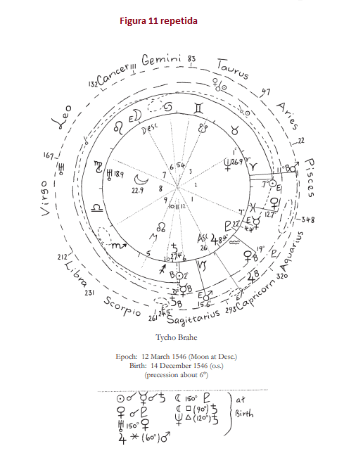 Así, de la casi conjunción de Urano y la Luna en la carta de Tycho Brahe concluimos lo siguiente: la Luna en el nacimiento es una imagen del descenso del alma desde las esferas más elevadas del cosmos hasta la encarnación. La Luna de época indica entonces, el descenso definitivo. Indica, simbólicamente, la región con la que la individualidad particular estuvo conectada entre la última muerte y el nuevo nacimiento. (Muy a menudo el Sol en el momento de la última muerte está en ese mismo lugar del Zodíaco.) Como la Luna de Tycho estaba en la constelación de Virgo —sabiduría divina—y brilló en la octava casa, consideramos esto como una sugerencia de que aquí nos enfrentamos a un ser humano altamente desarrollado espiritualmente. Además, esto fue enfatizado por la cercanía de Urano, el planeta que se encuentra, simbólicamente, más allá del portal al mundo invisible. Pero ¿qué indicaba este Urano?
