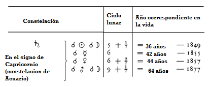 Este evento encontró su reflejo en las constelaciones prenatales de Venus. El 15 de agosto de 1812, Venus estaba en conjunción con Júpiter en los primeros grados de la constelación de Cáncer. Pasando posteriormente ante Saturno, la influencia de Venus fue realzada a lo grande por las experiencias profundas y difíciles que estaban por venir en el año 1857, transformando así el símbolo de Cáncer (♋) en una imagen del Espíritu cósmico que viene de un pasado primitivo, pasando por el tiempo presente de la vida humana y elevándolo otra vez en el futuro cósmico de la Tierra: