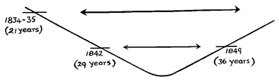 Fue en 1834-5 cuando Richard Wagner se unió con Minna Planer, quien se convirtió en su esposa. transcurridos aproximadamente 3 x 7 = 21 años desde entonces hasta el año 1855 del que ya hemos hablado. En el medio, estaban los acontecimientos de 1842 y 1849. En 1842, después de haber sufrido momentos de gran privación, Wagner regresó de París a Dresde, y 1849 fue el momento de su salida dramática de Dresden —su huida a Suiza. Al comparar los tres ciclos de siete años —como se indica en el dibujo— vemos que aproximadamente en la mitad del quinto período septenal (28-35) se produjo un punto de inflexión en la vida de Wagner.