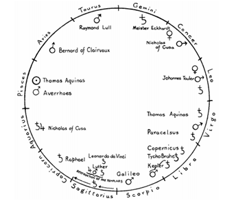 Significativamente, vemos cómo sucede esto en alguien como Nicolás de Cusa, quien muere el 11 de Agosto de 1464. Nacido entre los siglos XIV y XV, fue educado en la disciplina del pensamiento escolástico; pero su experiencia interior lo llevó por otro camino. Mientras viajaba por mar, tuvo una experiencia mística que lo hizo sentirse como bañado por el océano eterno del Espíritu, de un modo tal que la experiencia no llegó ya a alcanzar el reino del pensamiento. ‘Docta ignorancia’ fue como él llamó a esta experiencia de lo divino; así lo describe pues en su libro ‘De Docta Ignorantia’. Al momento de fallecer, ocurre una conjunción entre Saturno y Júpiter en la constelación de Acuario. Aquí vemos su conexión con el Escolasticismo. Por el otro lado, Marte y Venus se encuentran en la región de Cáncer y Leo. Esta es la imagen cósmica de su paso más interior hacia la esfera de la docta ignorancia. Entre las dos constelaciones, su experiencia marítima quedó inscrita en Aries.