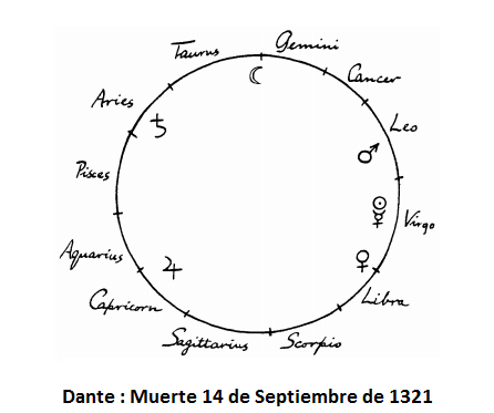 Un ejemplo histórico nos será de utilidad para ilustrar esto. Hallamos en la historia a la poderosa figura de Dante Aliguieri, quien causó gran impresión sobre la gente de la Edad Media con su poema La Divina Comedia. Consideraremos el horóscopo de su muerte (14 de Septiembre de 1321) para apreciar cómo se refleja el paso del destino.