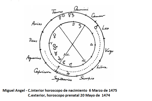 En primer lugar, en el horóscopo natal de Michelangelo, Júpiter se ubica sobre el mismo lugar que al morir Dante, en la constelación de Capricornio. Este hecho pareciera ya sugerir una especie de reminiscencia cósmica, algo similar a un lazo oculto entre el poeta y el artista. Pero no solamente esto; se revelan conexiones más profundas cuando tomamos en consideración al horóscopo prenatal.