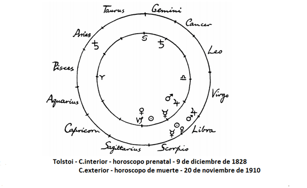 Podemos apreciar entonces cómo la problemática de Libra y de Escorpio que se indica en el horóscopo prenatal de Tolstoi y que corresponde a la gran crisis interior y la toma de decisiones en su vida, se ve finalmente trasmutada en un nuevo inicio –Saturno en Aries al fallecer.