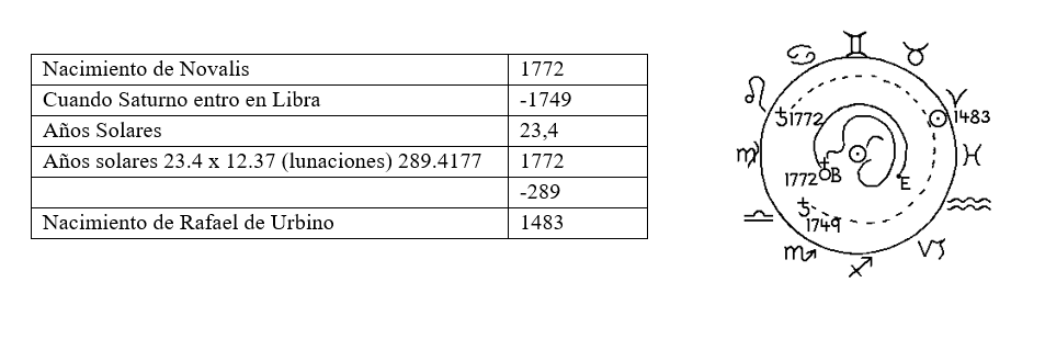 Novalis es el ejemplo perfecto, cosmológicamente, de karma y reencarnación. Sabemos que Saturno también está asociado con el karma humano y que representa al Padre Tiempo Omnipotente, quien guarda los secretos del tiempo y la reencarnación. Lo que buscamos es el tiempo transcurrido desde la última encarnación de Novalis, como Rafael, cuyo Sol está en Aries en 1483. Para ello deberíamos pedirle confirmación a Saturno.
